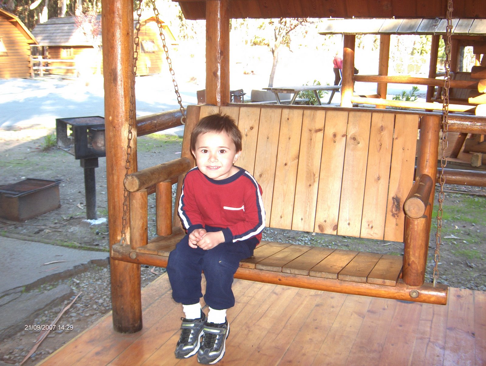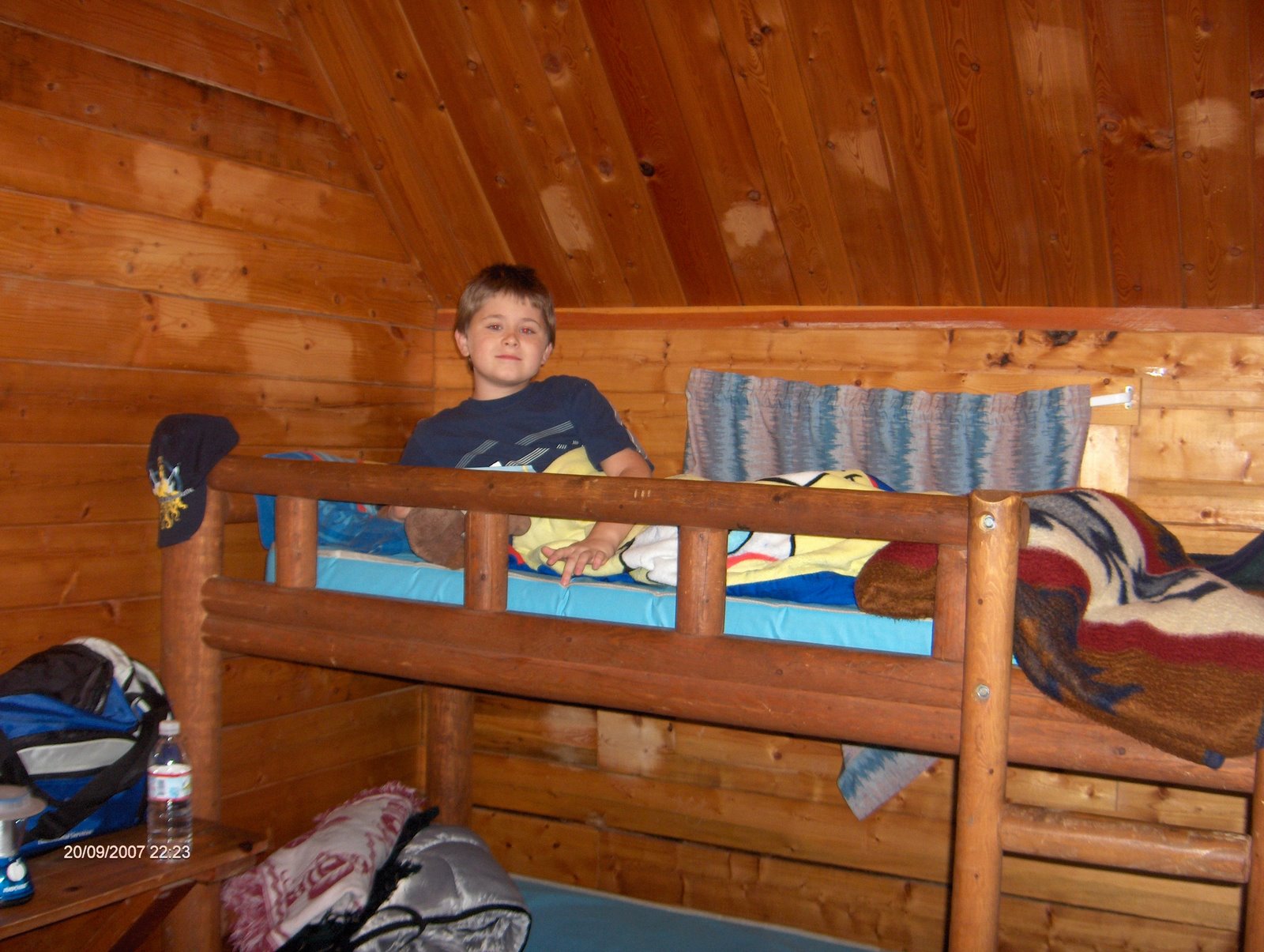"Don't believe the stories my Mom tells about me. You can see by my grin that I'm always sweet, right?"Okay, nightmare might be a bit of an exaggeration of our stay in the cabin...but not by much. We have not stayed in one of these cabins before so did not come as prepared as we would of had we known. The worst part was the beds. We were told to just bring our bedding but the beds had a mattress. I don't know if they should legally be allowed to call them a mattress or not. It was more like a nap mat given out to Preschoolers at day care but placed on wooden slats. It was bad... real bad. The next morning when our family all got together we mentioned that we didn't exactly sleep great so were going to leave and look for a store to buy a memory foam or something to make the next night bearable. That's when my brother (who's stayed here many times before) agreed that their mattresses really are horrible and that's why they bring an air mattress. Once we learned they had that we pounced... We ended up taking their "mattress" (which was twice as thick as ours and still bad) and putting it on top of our "mattress" making our bed possibly comfy enough to make it through just one more night.